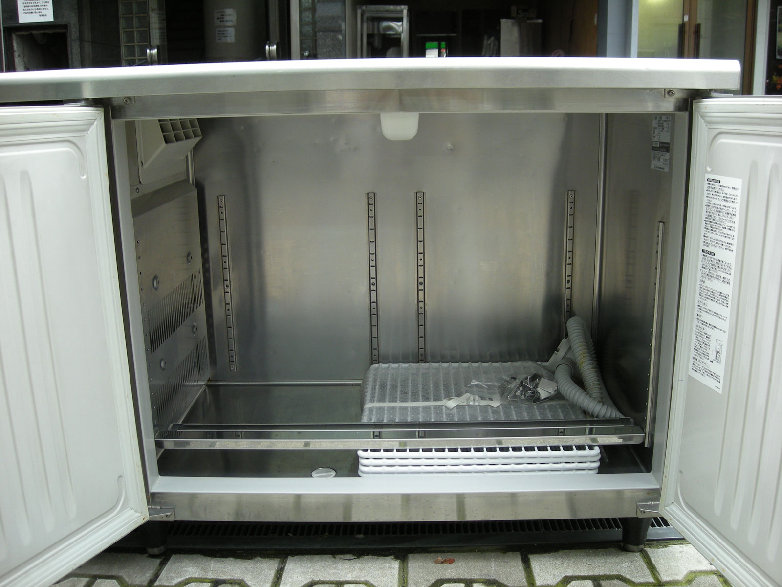 センターピラー方式の冷蔵庫です。写真のとおり、中柱がないので、大き目のホテルパンでもそのままで収納可能。